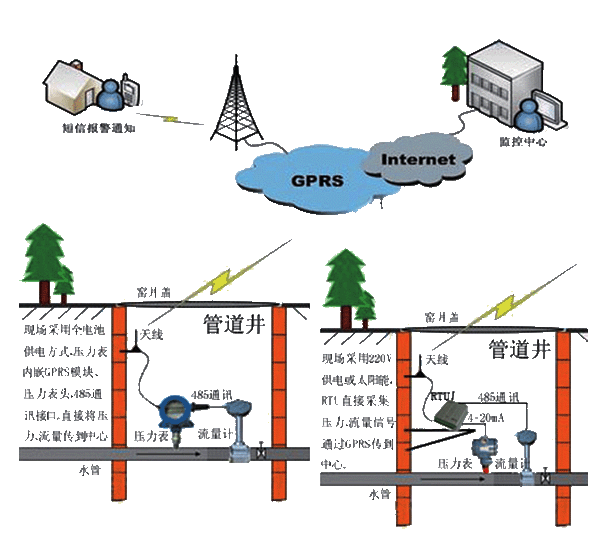 一、系統(tǒng)簡介 為保證供水工作的科學(xué)性,依靠現(xiàn)代計(jì)算機(jī)通信技術(shù)和傳感技術(shù),實(shí)施對(duì)供水管道的無人化遠(yuǎn)程實(shí)時(shí)監(jiān)測(cè),并且能夠自動(dòng)傳輸?shù)缴厦娓骷?jí)主管部門,監(jiān)測(cè)輸水管道、城市供水管道的壓力、流量信息;及時(shí)發(fā)現(xiàn)管網(wǎng)故障,提高維護(hù)效率、降低損失,保障輸水、供水質(zhì)量,達(dá)到科學(xué)預(yù)警,減少成本,提高效率的目的。 二、系統(tǒng)組成 v 監(jiān)控中心:中心服務(wù)器、外網(wǎng)固定IP、管網(wǎng)系統(tǒng)軟件; v 通信網(wǎng)絡(luò):基于移動(dòng)GPRS或者電信CDMA的通信網(wǎng)絡(luò)平臺(tái); v 采集終端:無線壓力表/低功耗遙測(cè)終端BTU; v 測(cè)量儀表:流量計(jì)/脈沖水表、壓力變送器、報(bào)警設(shè)備等; v 供電方式:電池供電、太陽能供電、市電。