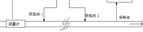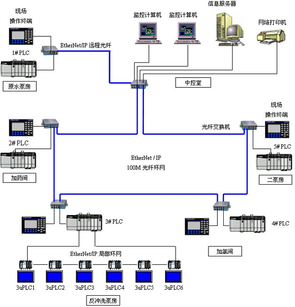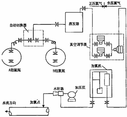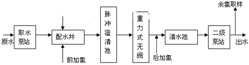 圖2 加氯工作流程圖 如圖2示:前加氯系統(tǒng)與后加氯系統(tǒng)共用一個(gè)氯氣氣源,共設(shè)兩組供氯氯瓶,兩組氯瓶互為備用.,根據(jù)氣瓶壓力自動切換。如當(dāng)正在使用的一組氯瓶出口管上的壓力小于某個(gè)值時(shí),壓力式自動切換器將自動切換到另一組氯瓶,保證連續(xù)供氯。在加氯自動控制系統(tǒng)中,將PLC的模擬量輸出信號送給加氯機(jī)的模擬量輸入端,通過控制加氯機(jī)中執(zhí)行器的動作,控制水射器中的真空度,進(jìn)而控制了加氯量的大小。加氯自動控制系統(tǒng)中還包括氯氣氣源的自動切換,漏氣自動報(bào)警和漏氯吸收裝置的自動控制。在加氯自動控制系統(tǒng)中,關(guān)鍵是對加氯機(jī)的控制。 自動控制氯系統(tǒng)可進(jìn)一步配備計(jì)算機(jī)數(shù)據(jù)采集系統(tǒng),以便實(shí)現(xiàn)加氯間無人值班目標(biāo)。把出廠水中的余氯分析儀測定的數(shù)據(jù)送到加氯間,中心化驗(yàn)室和調(diào)度室,以便值班人員可隨時(shí)監(jiān)測出廠水余氯值和調(diào)整余氯設(shè)定值。 3影響加氯自動控制的主要原因(1)采樣時(shí)間 采樣時(shí)間的長短,直接影響加氯的效果。為了達(dá)到自動控制的目的,要求氯氣經(jīng)充分混合后馬上檢查余氯值作為復(fù)合環(huán)控制的反饋信號。但現(xiàn)場中,有的工藝設(shè)計(jì)將混合接觸時(shí)間定的太長,對控制系統(tǒng)來說,即意味著純滯后時(shí)間的延長,造成測定結(jié)果不準(zhǔn)確。因此,在后加氯的投加點(diǎn)和采樣點(diǎn)的選擇上,工藝設(shè)計(jì)時(shí)應(yīng)充分考慮自動控制的要求。通常情況下,后加氯在清水池進(jìn)水管上,在氯氣與水充分混合后應(yīng)在盡可能短的時(shí)間內(nèi)取樣,水經(jīng)過加氯點(diǎn)到余氯分析儀處的水流時(shí)間一般不要超過5分鐘,在水與氯氣充分混合的前提下取樣時(shí)間越短越好??捎萌缦露N方法論縮短取樣時(shí)間:一是縮短取樣管的長度;二是加快取樣管中的水流速度如加大取樣水管排水分流管。(2)檢測設(shè)備 余氯分析儀的檢測值的正確性也是控制加氯的關(guān)鍵。由于余氯分析儀存在零點(diǎn)漂移,應(yīng)定期進(jìn)行校正。同時(shí)在軟件編制時(shí),對信號數(shù)據(jù)的處理也可考慮濾波、穩(wěn)定等形式進(jìn)行適當(dāng)處理以增加數(shù)據(jù)的可靠性。(3)信號傳輸 主要是各底層設(shè)備的檢測信號要及時(shí)準(zhǔn)確的傳輸?shù)絇LC中,然后進(jìn)行處理。現(xiàn)場中大都設(shè)備采用標(biāo)準(zhǔn)電流信號(0―20mA或4―20mA)。4 自動加氯系統(tǒng)的應(yīng)用 南方某一水廠,以江水為水源,水廠原設(shè)計(jì)規(guī)模為6萬m3/d。工藝流程如下示: